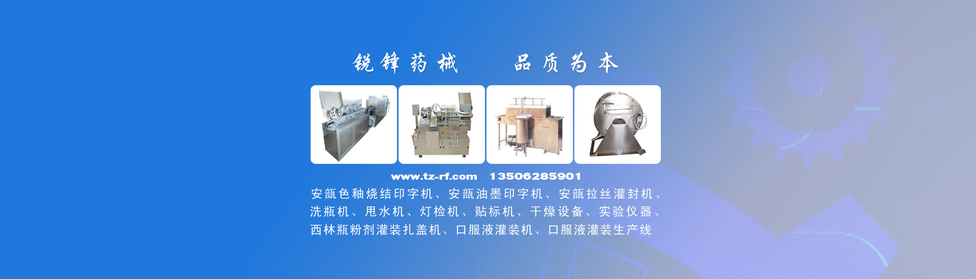 公司主要產品有:安瓿色釉燒結印字機、安瓿油墨印字機、安瓿拉絲灌封機、西林瓶粉劑灌裝機、洗瓶機、安瓿甩水機、燈檢機、貼標機、口服液灌裝機、口服液灌裝生產線、制藥機械、干燥設備、實驗儀器等,并可根據客戶要求非標定制生產。產品廣泛用于制藥、食品、保健品、化妝品等行業。